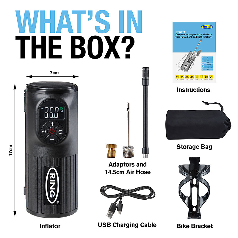 Get some air with the Ring RTC2000 Handheld Rechargeable Tyre Inflator. With a robust design and small size, you can take it anywhere with you in case of an emergency.