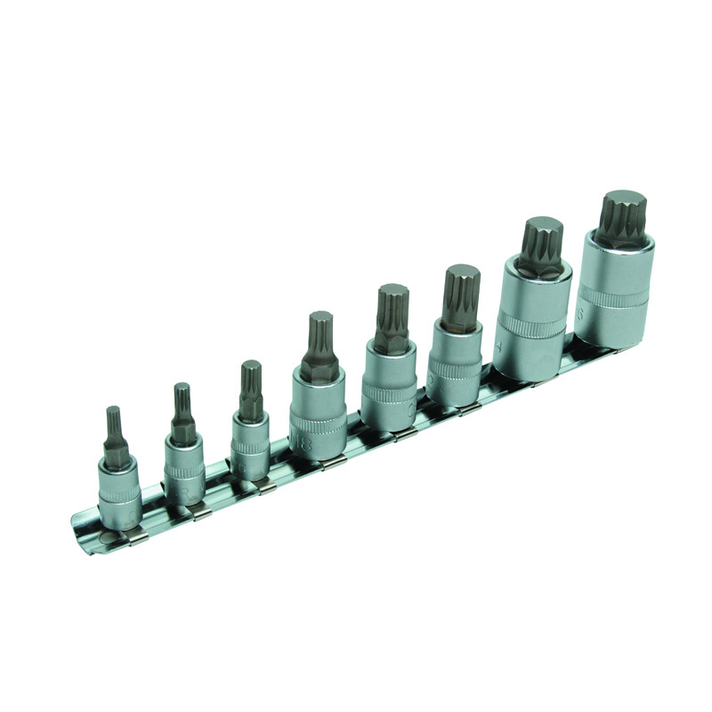 Spline bit set of short socket bits from M4 to M16 in three drive sizes. Knurled ring for extra grip and supplied with a socket rail. Manufactured from chrome vanadium and impact grade steel.